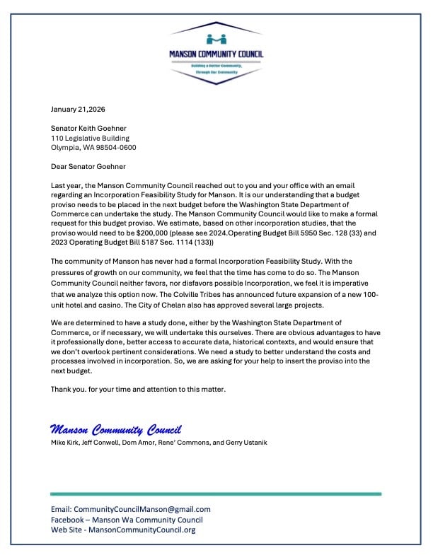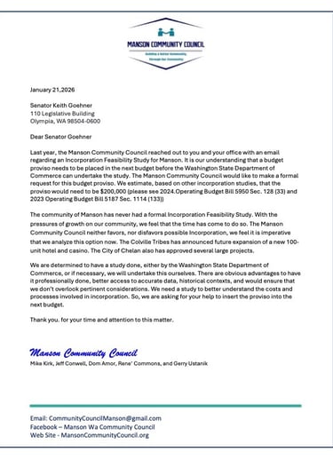 The following letter was sent to our State Senator Keith Goehner and our two State Representatives requesting a $200,000.00 budget proviso for an Incorporation Feasibility Study